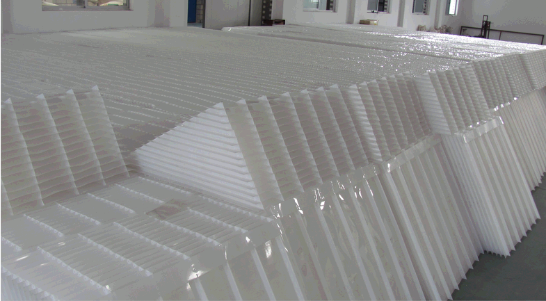 斜板填料主要由共聚及聚丙烯材料混合制成。從淺層理論的基礎講,在斜板上部設置沉淀距離合理的沉淀段,在下部控制斜板的幾何形狀,使斜板下部形成穩定的接觸絮凝段,通過接觸作用和淺池沉淀機理達到礬花與水分離的目的。各種間距斜板填料均是通過不同高度的塑料肋條來支撐斜板片,肋條與斜板熱熔焊接,每兩層斜板片之間需要多根肋條支撐,組裝工藝復雜,而且傳統斜板內部水流流道成矩形,常適用于上向流沉淀池。 斜板填料規格參考表(備注:斜長為1m計算) 片厚(單位:mm) 平板(單位:張) 重量(單位:kg) 肋條(單位:根) (板間距)25 0.8 32 33 7 1 32 39 7 (板間距)28 0.8 30 32 7 1 30 37 7 (板間距)30 0.8 28 30 7 1 28 35 7 (板間距)50 1 18 26 7 (板間距)80 1.5 11 25 7 (板間距)100 2 8 24 7